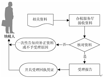 (1)办税服务厅接收资料,核对资料是否符合法定形式,符合的即时办结;不符合的当场一次性告知应补正资料或不予受理原因。