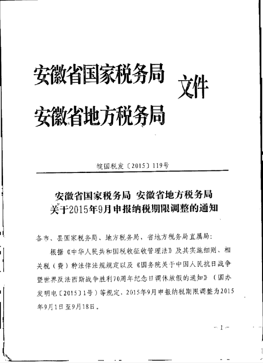 安徽省国家税务局 安徽省地方税务局关于2015年9月申报纳税期限调整的通知